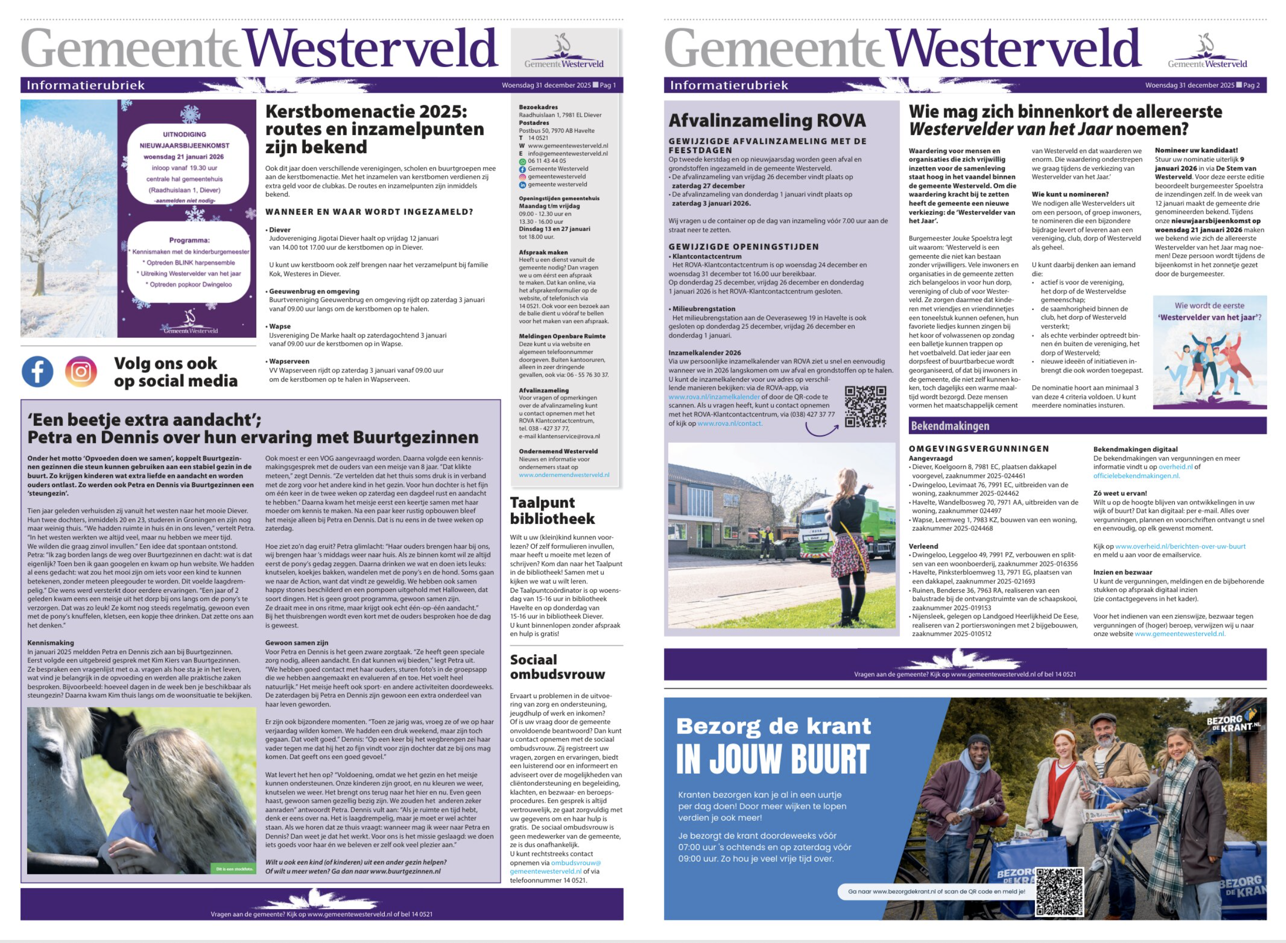 31 december 2025 – In de krant en online geeft Gemeente Westerveld aandacht aan Buurtgezinnen, met een voorbeeld van een stel dat de ruimte in hun huis en hun leven, zinvol wilde invullen. Ze werden steungezin van een 8-jarig meisje. Ze vertellen hoe het proces is gegaan met coördinator Kim Kiers en hoe die ene dag in de twee weken eruit ziet als ze bij hen komt. ‘Het is geen groot programma, gewoon samen zijn. Ze draait mee in ons ritme, maar krijgt ook echt één-op-één aandacht.’ En: ‘We doen iets goeds voor haar én we beleven er zelf ook veel plezier aan.’