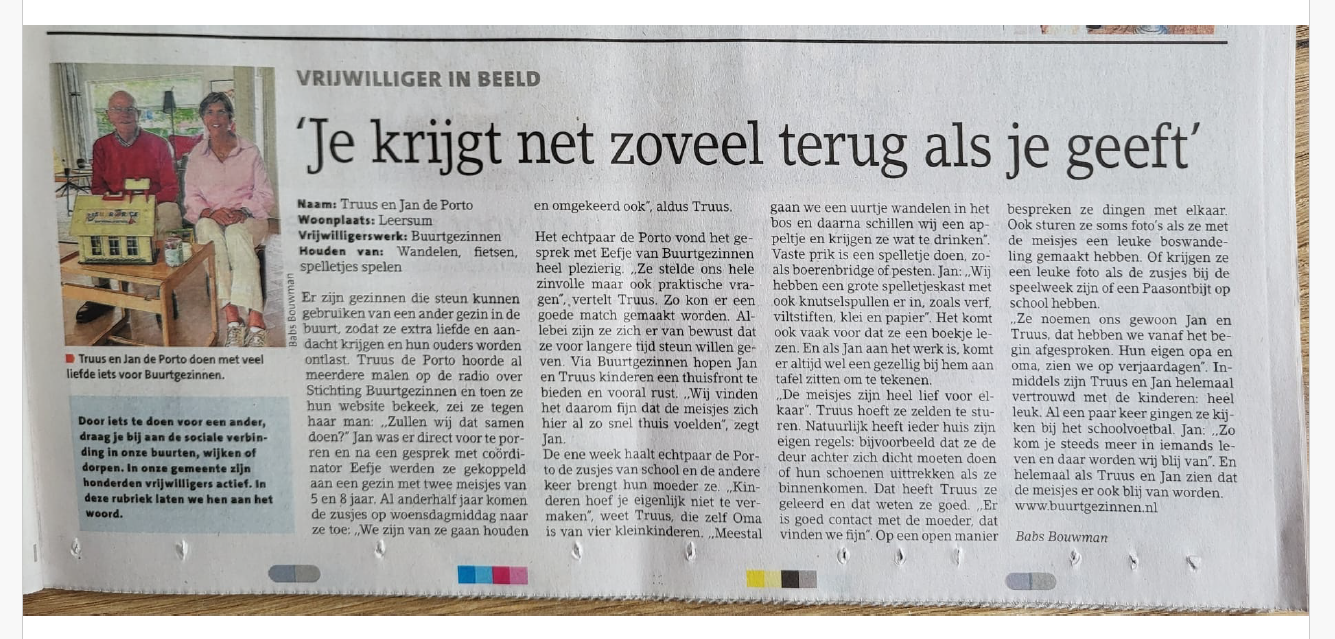 ‘Je krijgt zoveel terug als je geeft’ – Nieuwsblad De Kaap Utrechtse Heuvelrug, juni 2025 – Vrijwilligers Truus en Jan de Porto ontvangen al 1,5 jaar twee zusjes op woensdagmiddag. Klik op de afbeelding om te vergroten. Dianne van Jaarsveld2025-09-29T16:08:14+01:00 Deel dit verhaal, kies je platform! FacebookXLinkedInWhatsAppE-mail Gerelateerde berichten Mensen helpen elkaar graag – Heuvelrug Zodat ouders even op adem kunnen komen – Heuvelrug Samen sterker met Buurtgezinnen – Heuvelrug ‘Zo kan moeder even bijkomen’ – Heuvelrug Gezinnen helpen elkaar met opvoeden in Doorn – RTV Utrecht Buurtgezinnen koppelt al vijf jaar gezinnen aan elkaar – Nieuwsblad De Kaap