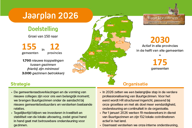 De officiële missie van de Stichting Buurtgezinnen (RSIN 8544.18.635) is: Bevorderen dat kinderen veilig en gezond kunnen opgroeien in hun eigen gezin en voorkomen dat kinderen uit huis worden geplaatst. Dit proberen we te bereiken door ouders tijdig te ontlasten, kinderen extra aandacht en liefde te geven en het steunend netwerk van het gezin uit te breiden.
